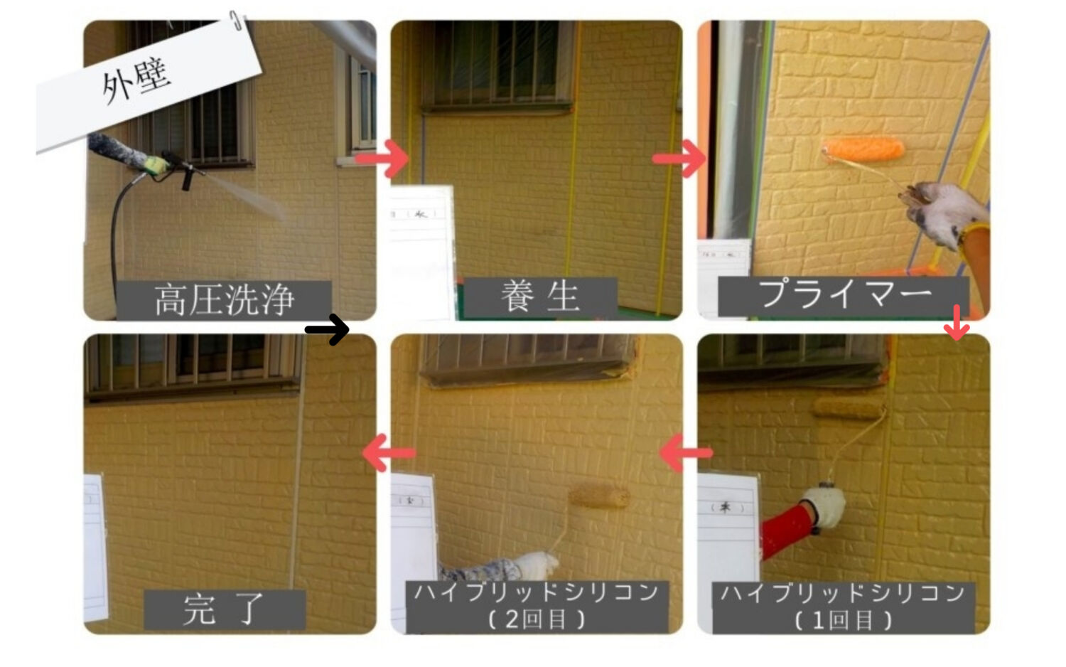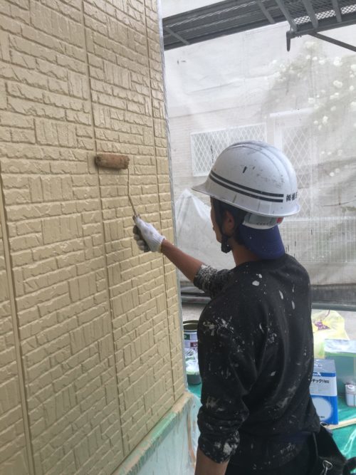 まず外壁塗装をするには、表面に付いている汚れやコケ等を高圧洗浄で落し、養生(塗装しない箇所をテープで覆う作業)をします。その後、3層塗装で仕上げていきます。