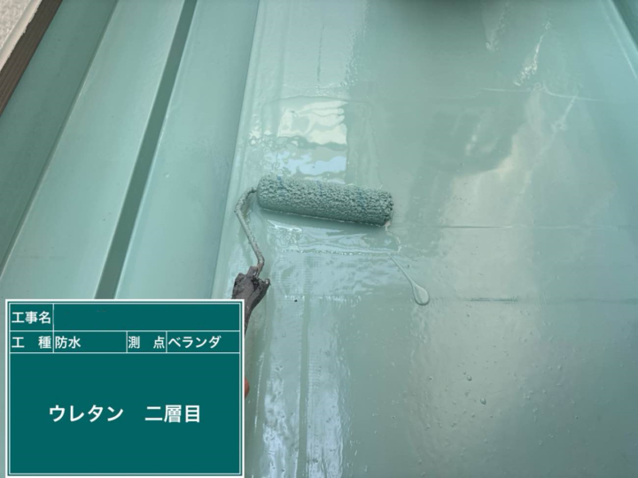 1層目が乾燥した後、2層目のウレタン防水材を塗布して厚みを確保します。