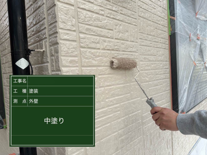 中塗りは、塗料の機能(防水性・耐候性・遮熱性など)をしっかり発揮させるために必要な塗膜の厚みを確保するために行います。