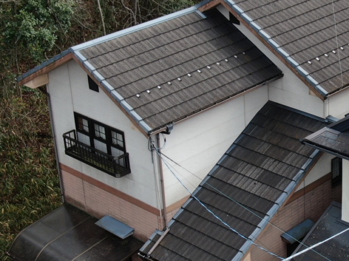 長年の雨風・紫外線・ほこり・鳥のフン・落ち葉などが積もり、表面に**コケ・カビ・藻・埃・チョーキング粉(劣化塗膜の白い粉)**がこびりついています。
