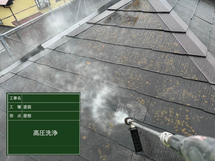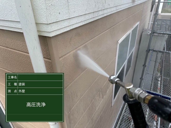汚れが残ったままだと、ムラやはがれの原因になりまするので、高圧洗浄で下地を整えます。