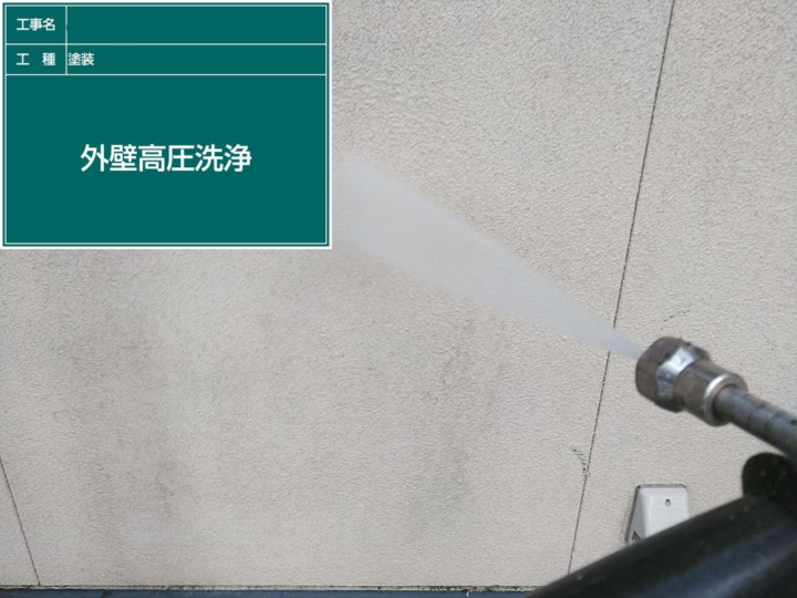 塗装前に外壁に付着している汚れや古い塗料をきれいに落とし、密着性を良くする為に行います。