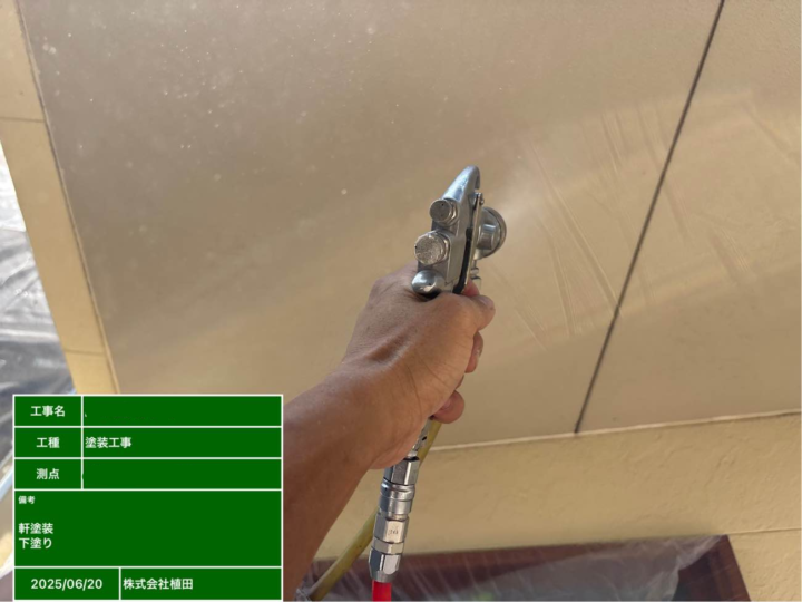 下塗りをすることで、上塗り塗料がしっかりと軒天材に密着し、塗膜の剥がれを防ぎます。