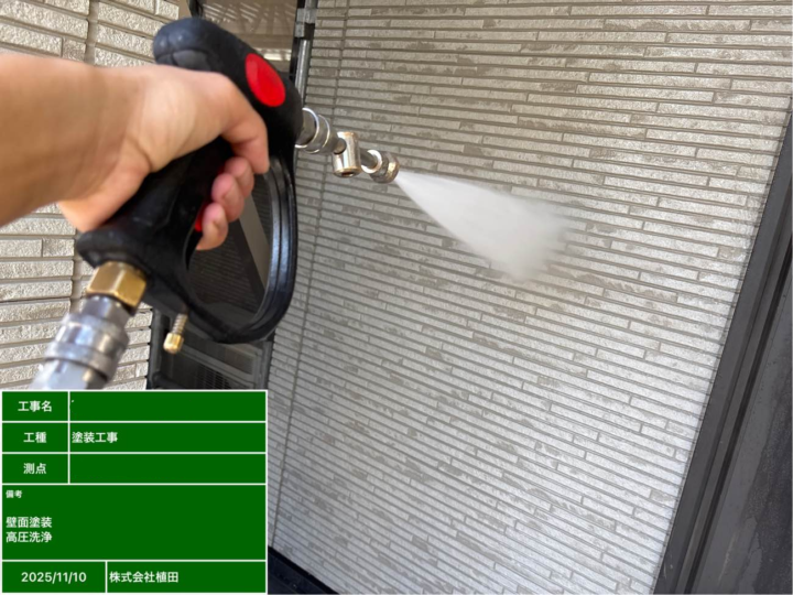塗装前に汚れ・コケ・カビ・古い塗膜を強力な水圧で洗い流す工程です。これらを除去せずに塗装すると、塗料が密着せず、早期の剥がれや劣化の原因になります。