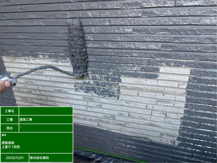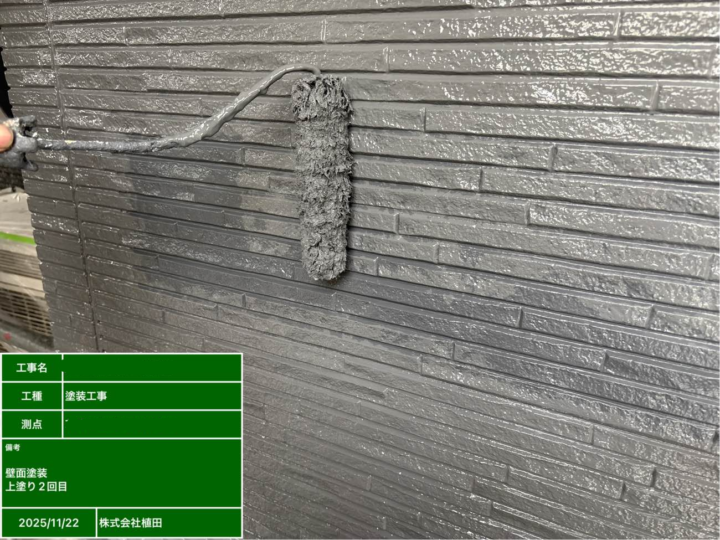 外壁の色や質感を整え、塗膜に厚みを持たせる工程です。