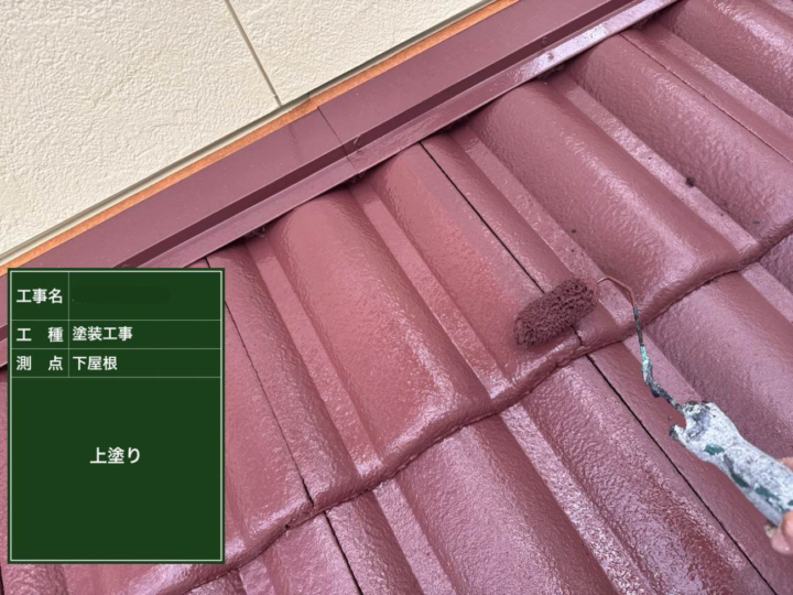 中塗りで形成した塗膜の上に、同じ塗料をもう一度重ねることで、色の深みと光沢が増し、紫外線や雨風などの外的ダメージから屋根を長期間保護します。