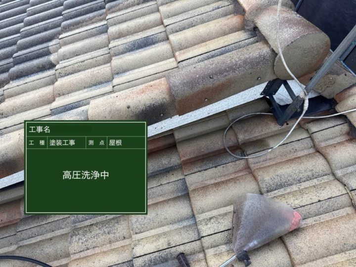 塗装前に屋根表面の汚れ・コケ・カビ・古い塗膜をしっかり除去し、新しい塗料の密着を高めるためです。