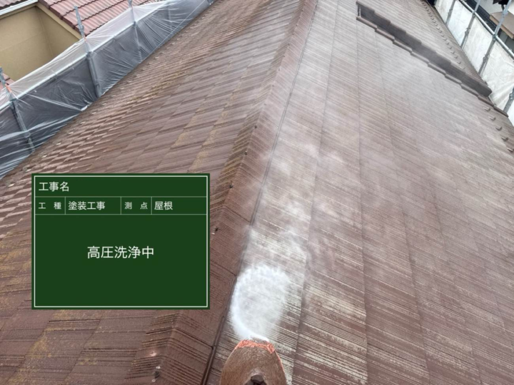 業務用高圧洗浄機でしっかり除去し、塗料の密着性を高めることが目的です。