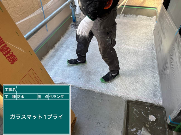「ガラスマット1プライ」とは、FRP防水でガラスマットを1層施工する方法。