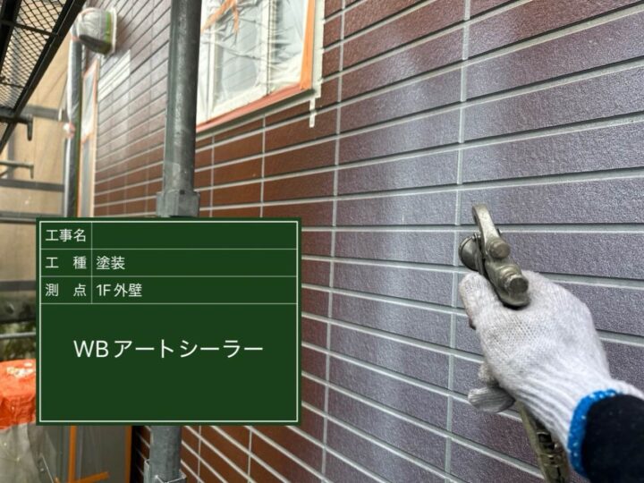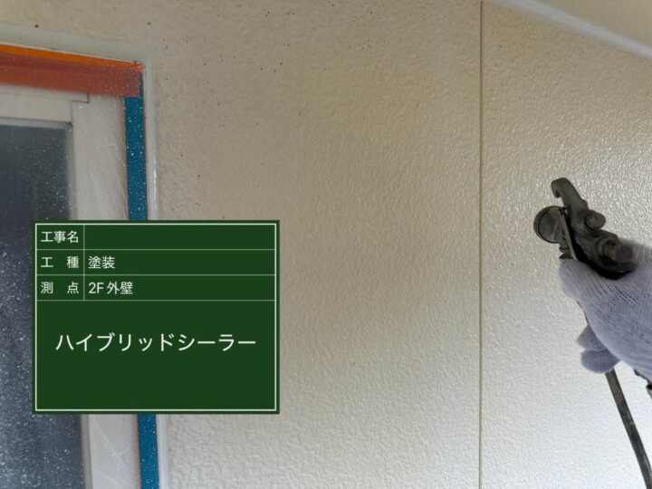 外壁2階の下塗りにはハイブリッドシーラーを使用し、下地の吸い込みを均一化します。